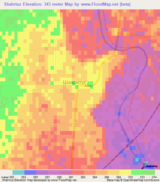 Below is the Elevation map of Shahrtuz,Tajikistan, which displays range of elevation with different colours.
