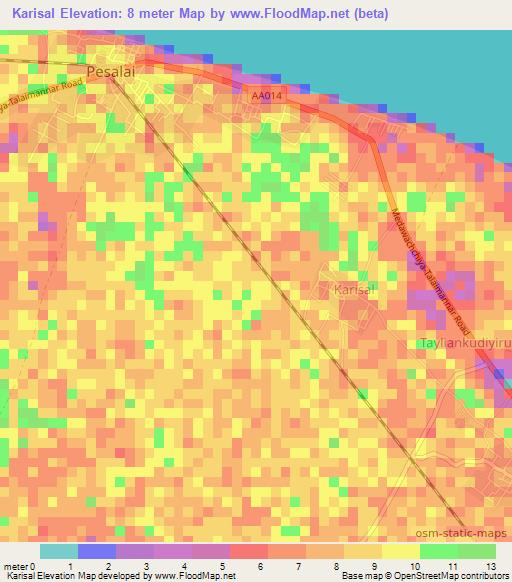 Karisal,Sri Lanka Elevation Map is displayed at different zoom levels.