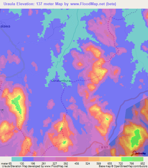 Below is the Elevation map of Uraula,Sri Lanka, which displays range of elevation with different colours.