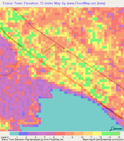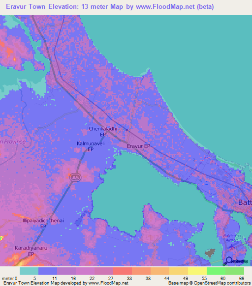 Note:Please note that Eravur Town,Sri Lanka Elevation Map is in beta.