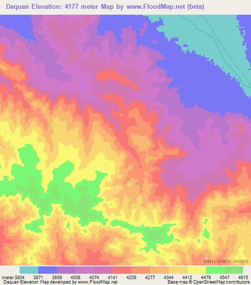 Below is the Elevation map of Daquan,China, which displays range of elevation with different colours.