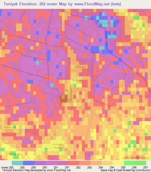 Tentyak,Uzbekistan Elevation Map is displayed at different zoom levels.