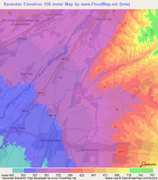 Below is the Elevation map of Kavardan,Uzbekistan, which displays range of elevation with different colours.