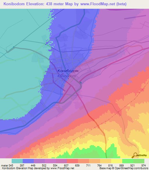 Below is the Elevation map of Konibodom,Tajikistan, which displays range of elevation with different colours.