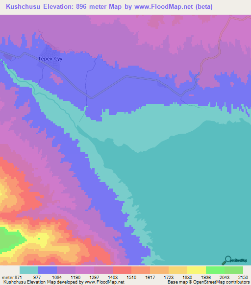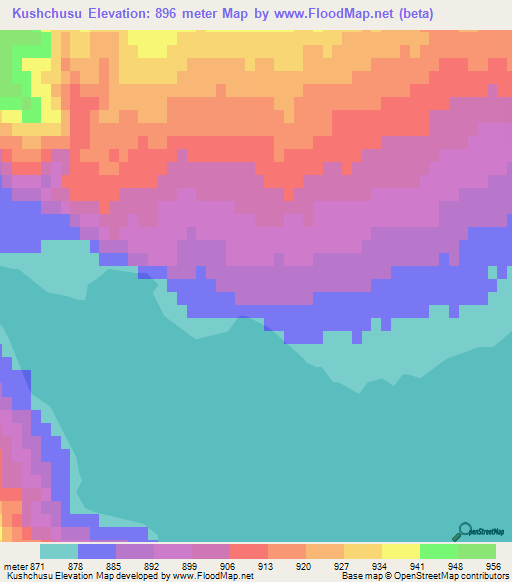 Below is the Elevation map of Kushchusu,Kyrgyzstan, which displays range of elevation with different colours.
