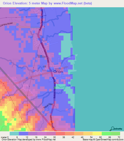 Below is the Elevation map of Orion,Philippines, which displays range of elevation with different colours.