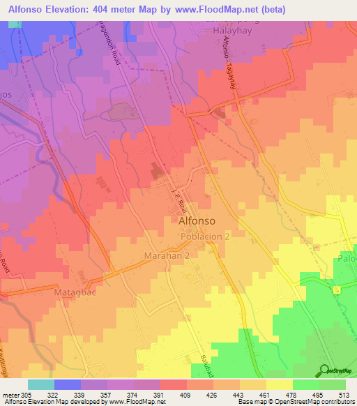 Below is the Elevation map of Alfonso,Philippines, which displays range of elevation with different colours.