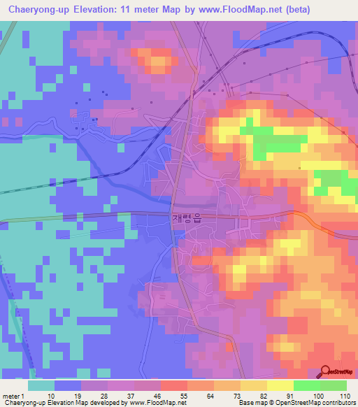 Below is the Elevation map of Chaeryong-up,North Korea, which displays range of elevation with different colours.