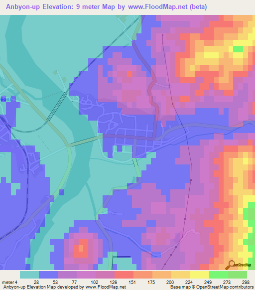Below is the Elevation map of Anbyon-up,North Korea, which displays range of elevation with different colours.