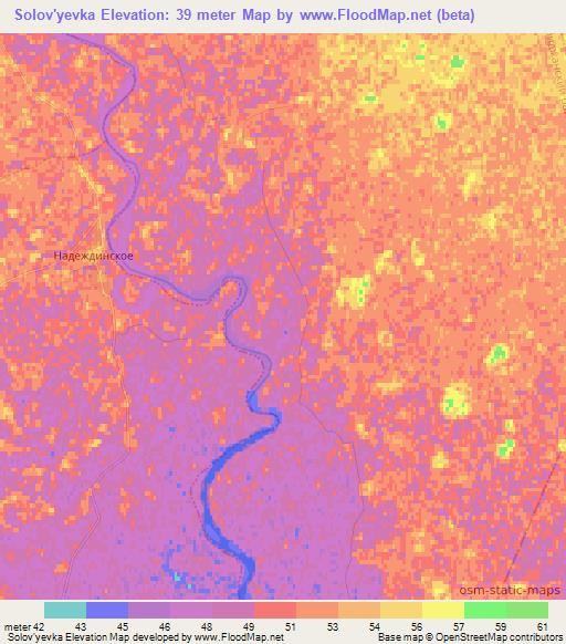 Below is the Elevation map of Solov'yevka,Russia, which displays range of elevation with different colours.