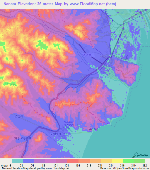 The elevation map of Nanam,North Korea is generated using elevation data from NASA's 90m resolution SRTM data.