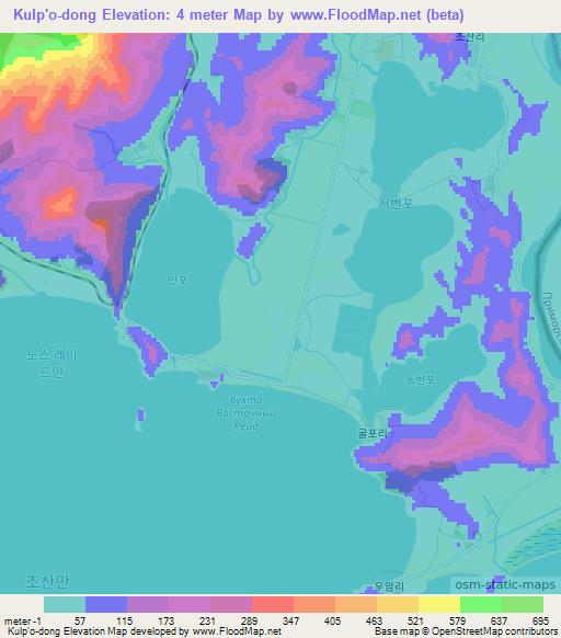 Kulp'o-dong,North Korea Elevation Map is displayed at different zoom levels.