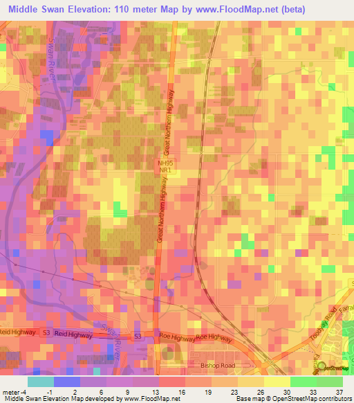 Below is the Elevation map of Middle Swan,Australia, which displays range of elevation with different colours.