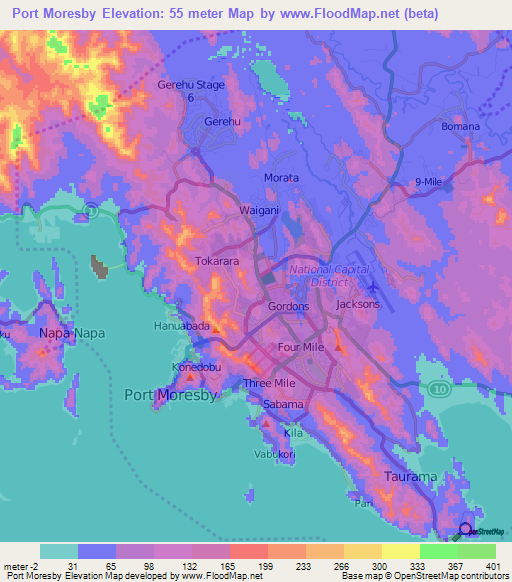 Note:Please note that Port Moresby,Papua New Guinea Elevation Map is in beta.