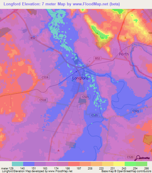 Below is the Elevation map of Longford,Australia, which displays range of elevation with different colours.