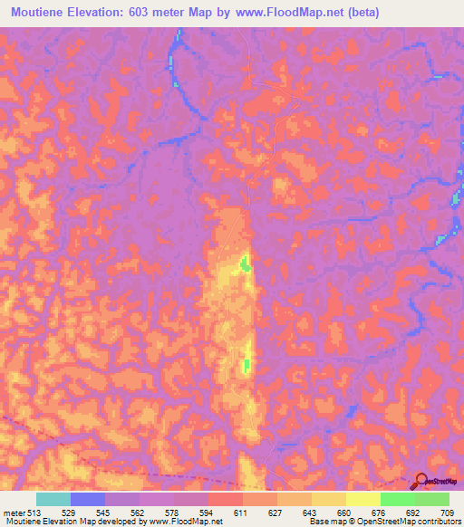 Below is the Elevation map of Moutiene,Congo (Brazzaville), which displays range of elevation with different colours.