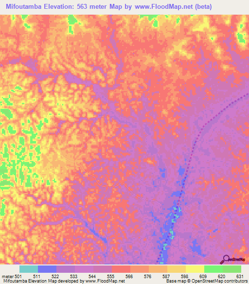 Below is the Elevation map of Mifoutamba,Congo (Brazzaville), which displays range of elevation with different colours.