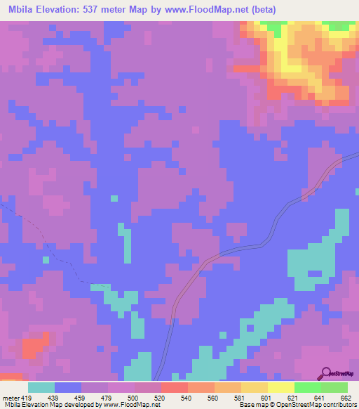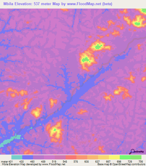 Below is the Elevation map of Mbila,Congo (Brazzaville), which displays range of elevation with different colours.