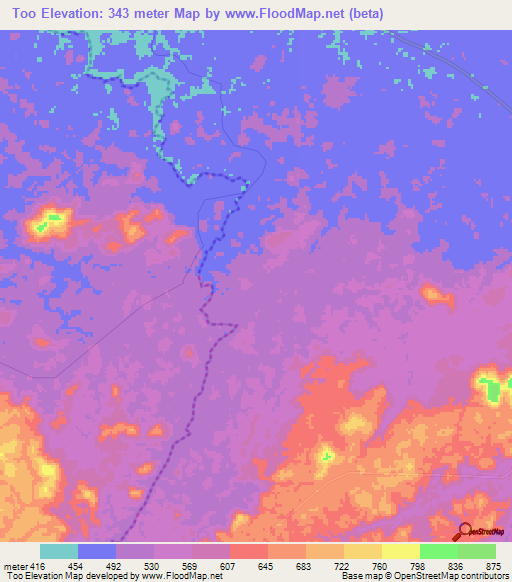 Below is the Elevation map of Too,Equatorial Guinea, which displays range of elevation with different colours.