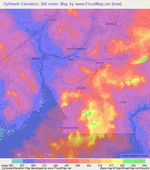 Zyiliwele,Burkina Faso Elevation Map is displayed at different zoom levels.