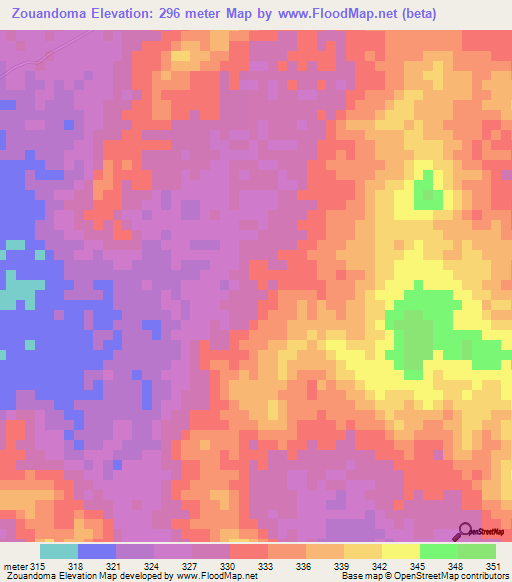Below is the Elevation map of Zouandoma,Burkina Faso, which displays range of elevation with different colours.