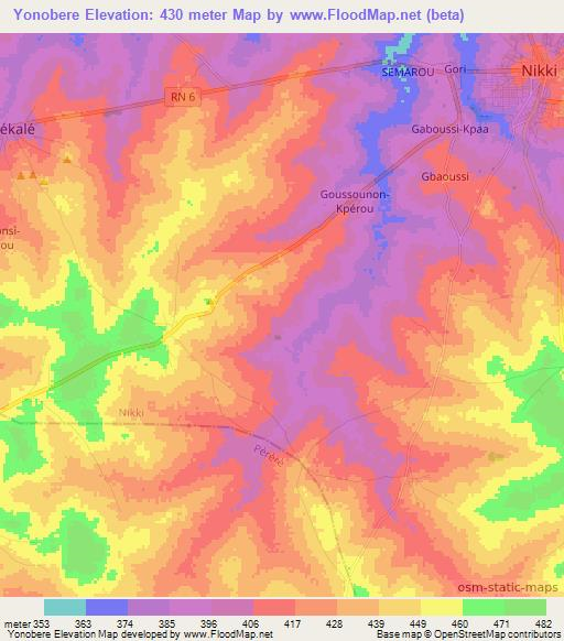Yonobere,Benin Elevation Map is displayed at different zoom levels.