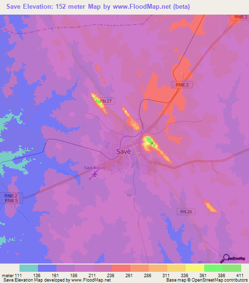 Below is the Elevation map of Save,Benin, which displays range of elevation with different colours.