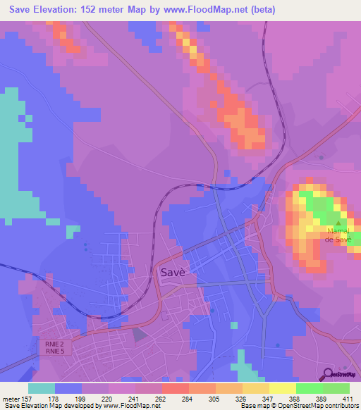 The elevation map of Save,Benin is generated using elevation data from NASA's 90m resolution SRTM data.