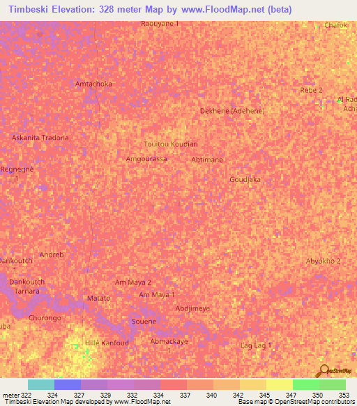 Below is the Elevation map of Timbeski,Chad, which displays range of elevation with different colours.