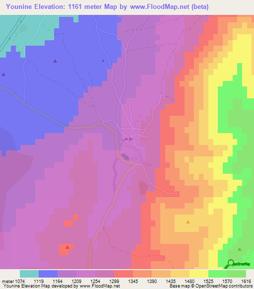 Below is the Elevation map of Younine,Lebanon, which displays range of elevation with different colours.