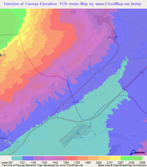 Below is the Elevation map of Temnine el Faouqa,Lebanon, which displays range of elevation with different colours.