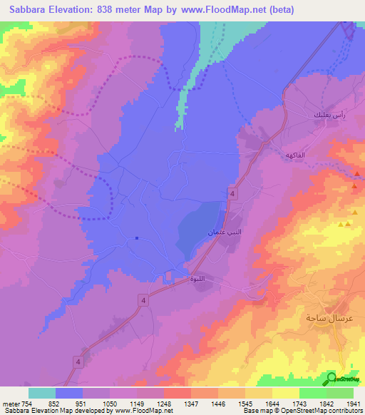 Below is the Elevation map of Sabbara,Lebanon, which displays range of elevation with different colours.