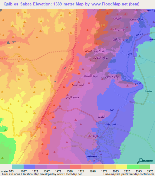 Below is the Elevation map of Qalb es Sabaa,Lebanon, which displays range of elevation with different colours.