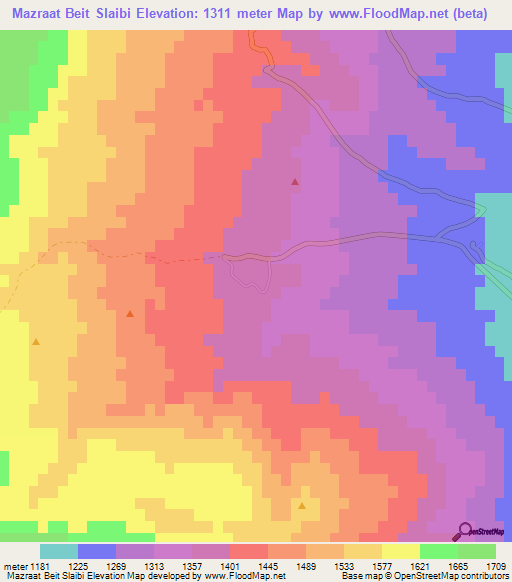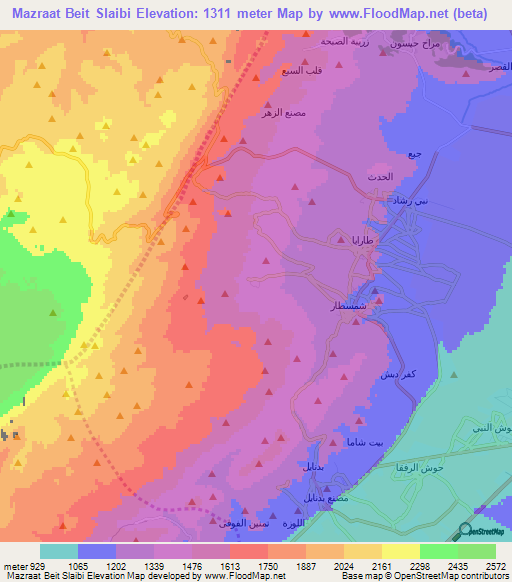Below is the Elevation map of Mazraat Beit Slaibi,Lebanon, which displays range of elevation with different colours.