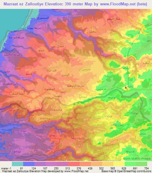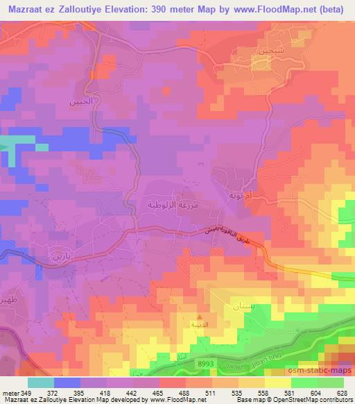 Mazraat ez Zalloutiye,Lebanon Elevation Map is displayed at different zoom levels.