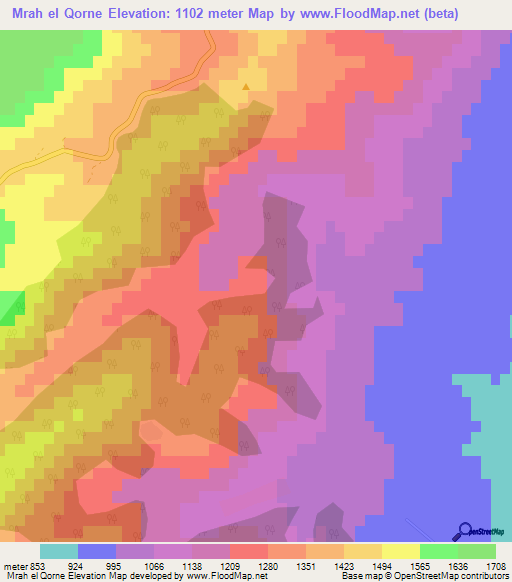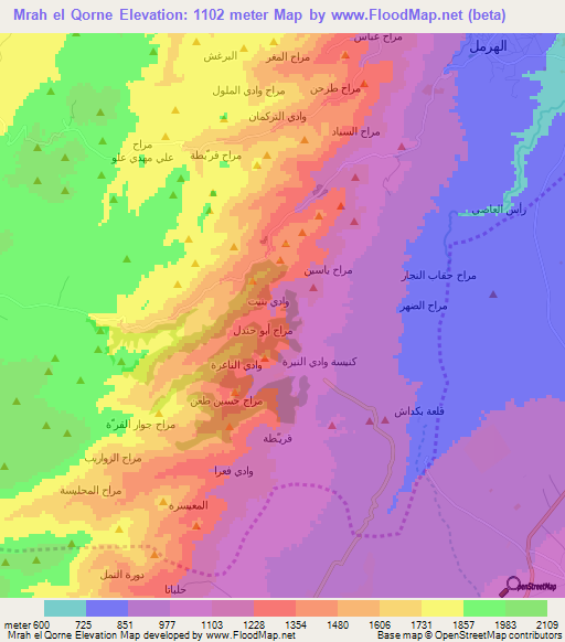 Below is the Elevation map of Mrah el Qorne,Lebanon, which displays range of elevation with different colours.