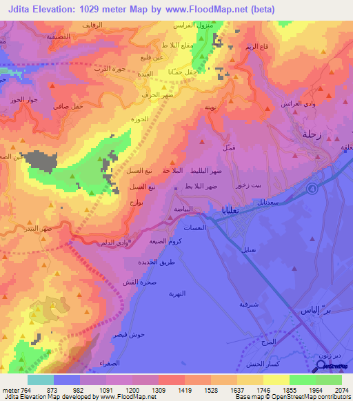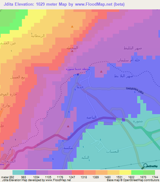 Below is the Elevation map of Jdita,Lebanon, which displays range of elevation with different colours.