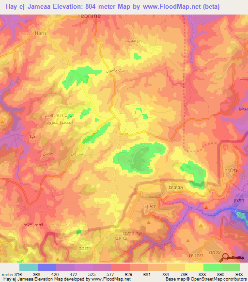 Below is the Elevation map of Hay ej Jameaa,Lebanon, which displays range of elevation with different colours.