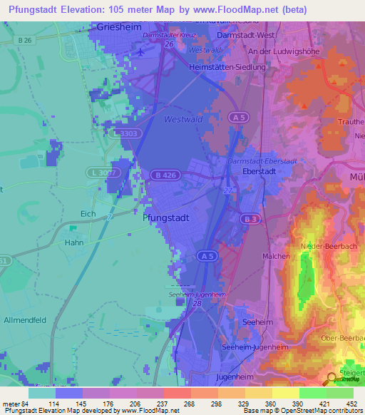 Note:Please note that Pfungstadt,Germany Elevation Map is in beta.