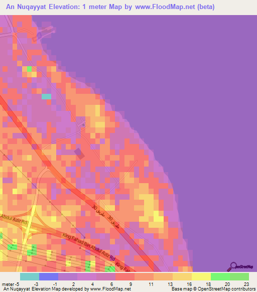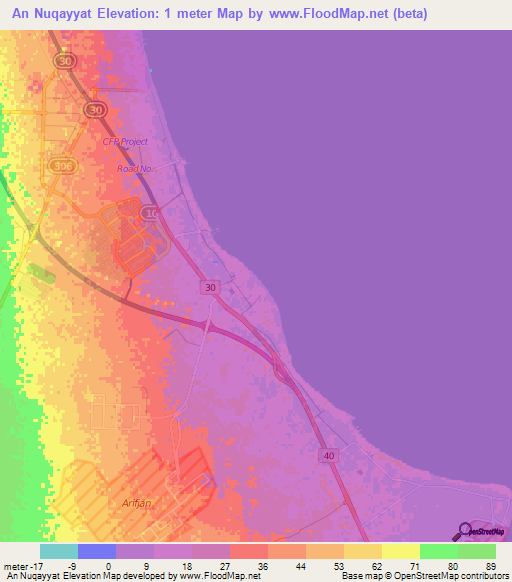 Below is the Elevation map of An Nuqayyat,Kuwait, which displays range of elevation with different colours.