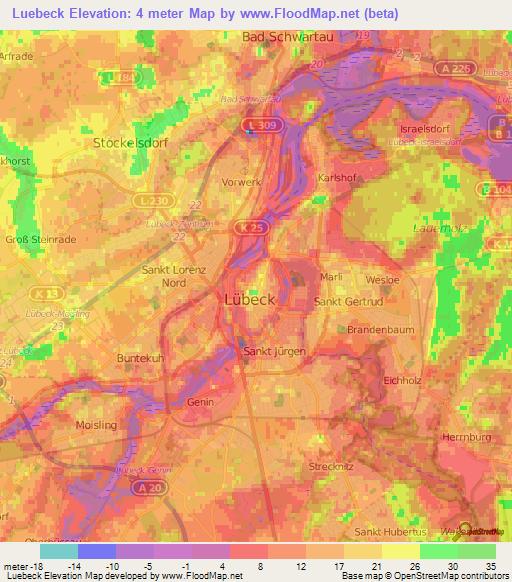 Below is the Elevation map of Luebeck,Germany, which displays range of elevation with different colours.