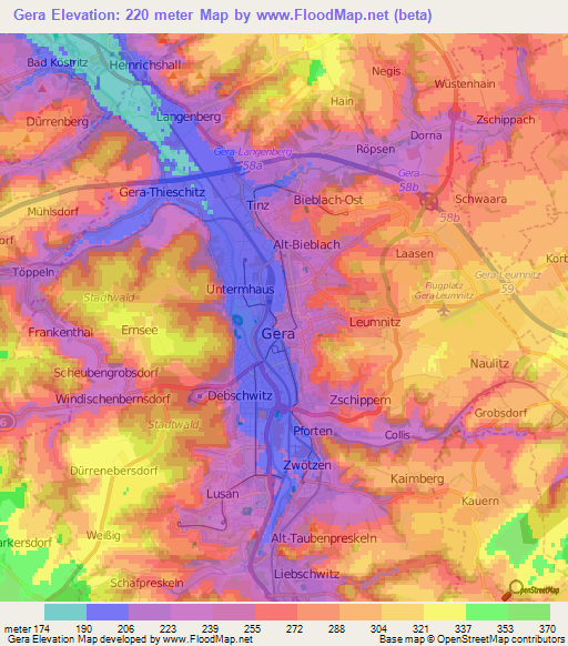 Below is the Elevation map of Gera,Germany, which displays range of elevation with different colours.