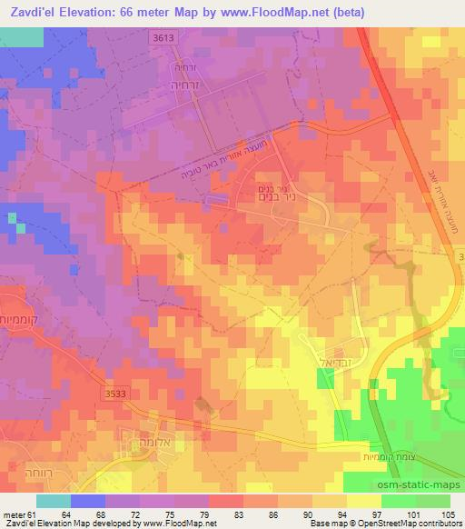 Below is the Elevation map of Zavdi'el,Israel, which displays range of elevation with different colours.