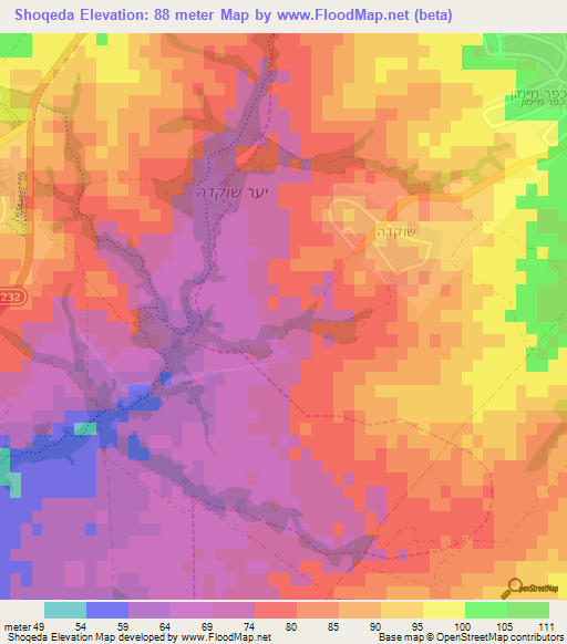 Below is the Elevation map of Shoqeda,Israel, which displays range of elevation with different colours.