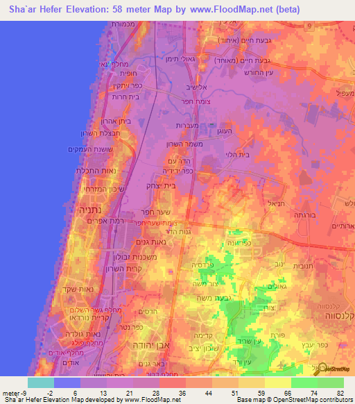 Below is the Elevation map of Sha`ar Hefer,Israel, which displays range of elevation with different colours.