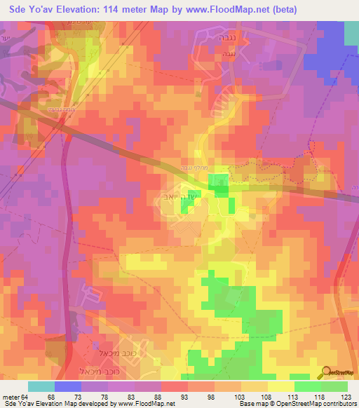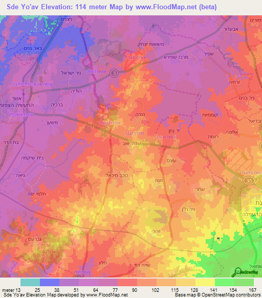 Below is the Elevation map of Sde Yo'av,Israel, which displays range of elevation with different colours.