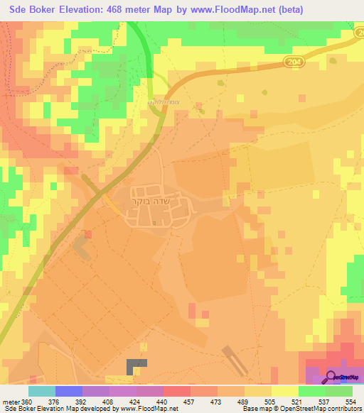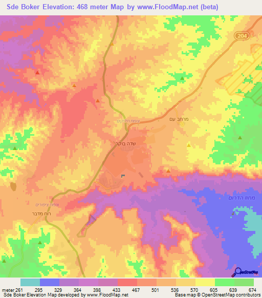 Below is the Elevation map of Sde Boker,Israel, which displays range of elevation with different colours.
