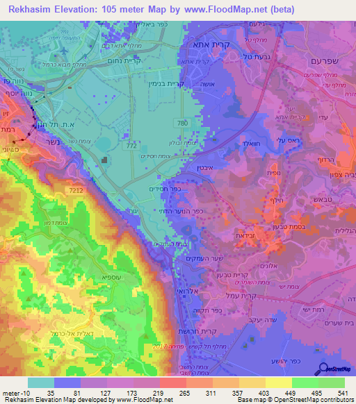 Below is the Elevation map of Rekhasim,Israel, which displays range of elevation with different colours.