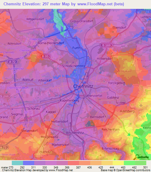 Below is the Elevation map of Chemnitz,Germany, which displays range of elevation with different colours.