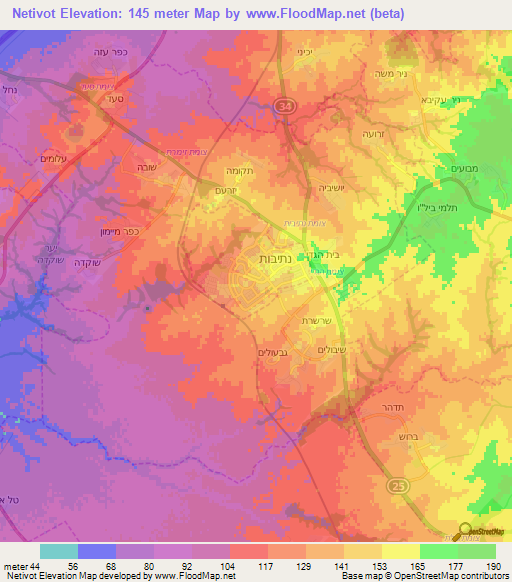 Below is the Elevation map of Netivot,Israel, which displays range of elevation with different colours.